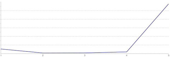 曾几何时,YouTube也使用这种五星评分系统。不过在2010年中期,他们就换用了现行的“赞/踩”评价系统。为什么呢?因为星级分布呈现下列趋势: